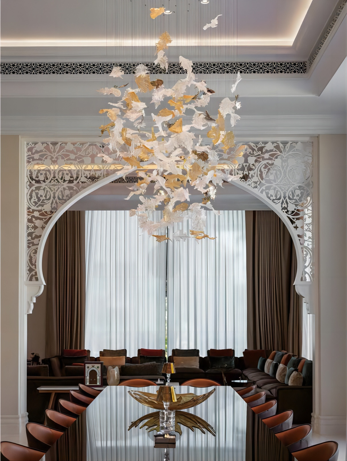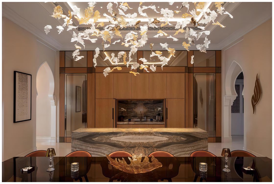 Ten spersonalizowany żyrandol w kształcie liścia klonu jest inspirowany liśćmi klonu i łączy elegancję liści klonu z oświetleniem, tworząc wysoce artystyczną i dekoracyjną lampę. Każda zawieszka w kształcie liścia klonu jest wykonana z precyzyjnego szkła, ukazując fakturę i kontur liścia klonu, realistycznie. Ogólny kształt żyrandola z zawieszkami w kształcie liści klonu jest elegancki i unikalny. Jest zarówno urządzeniem oświetleniowym, jak i dziełem sztuki, doskonale integrując się z tematem dekoracyjnym sali bankietowej.