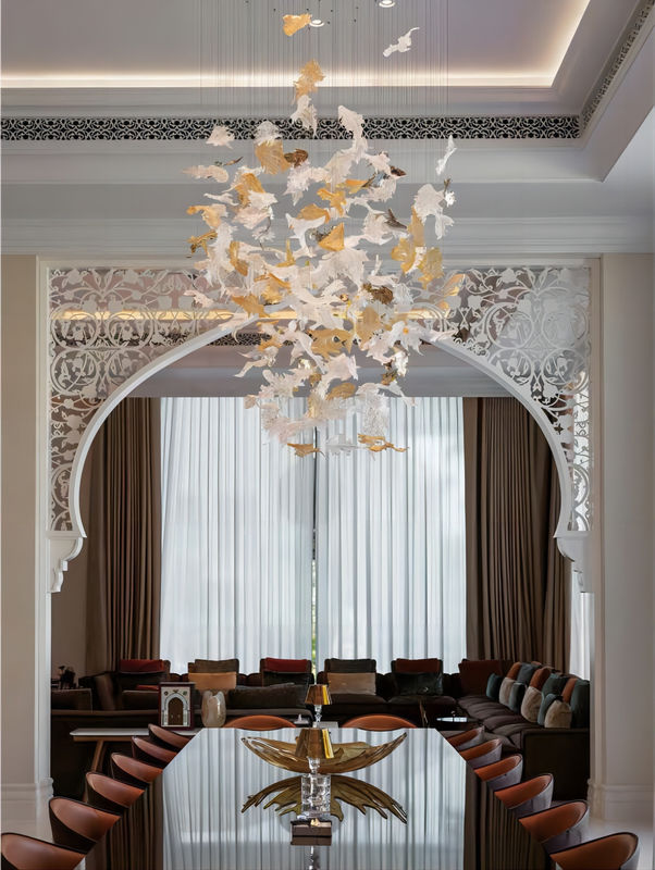 Ten niestandardowy, spersonalizowany szklany żyrandol w kształcie liścia klonu jest główną atrakcją projektu dekoracji artystycznej w sali bankietowej hotelu. Jego unikalny design podkreśla cechy personalizacji i szklanych zawieszek w kształcie liści klonu. Jest to lampa, która łączy w sobie personalizację, wykwintne rzemiosło i artystyczną dekorację, zapewniając wyjątkową przyjemność wizualną i tworzenie atmosfery w sali bankietowej hotelu.