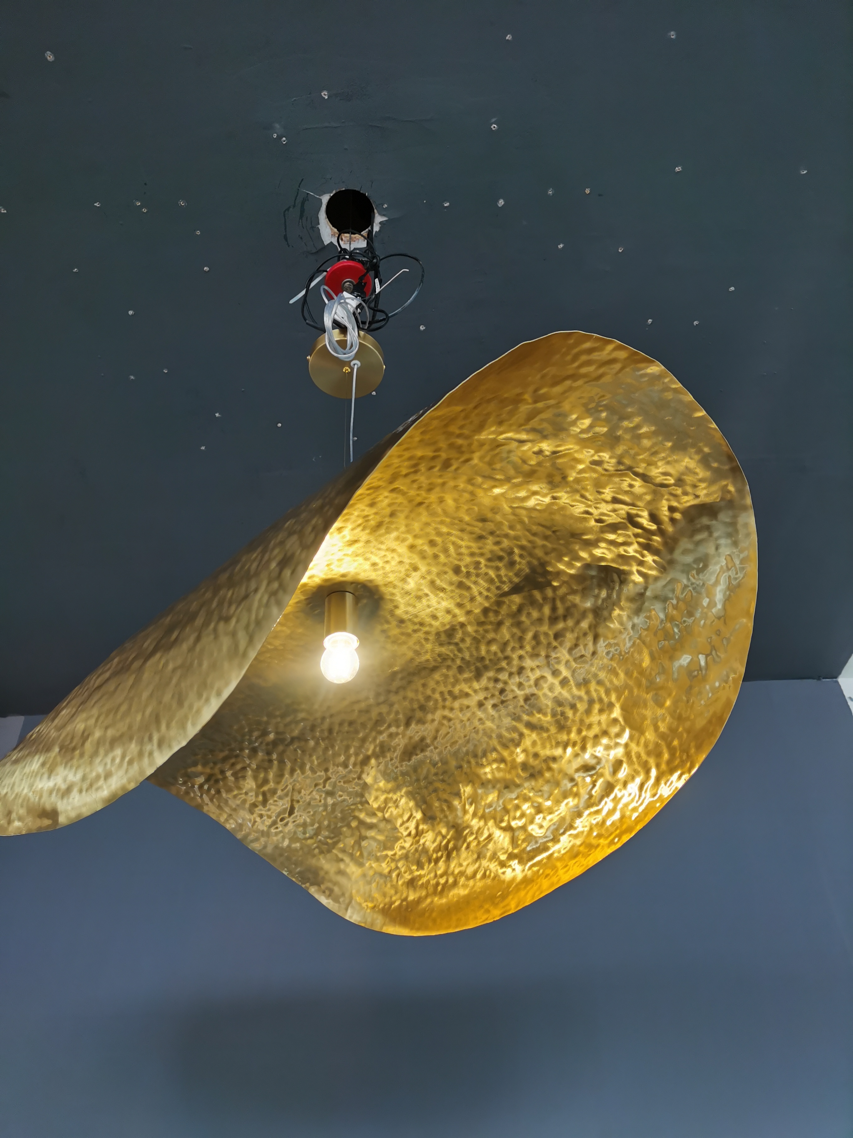 Ostrzegawcze oświetlenie w kształcie liścia, łączące współczesną estetykę przemysłową z artystyczną kreatywnością.