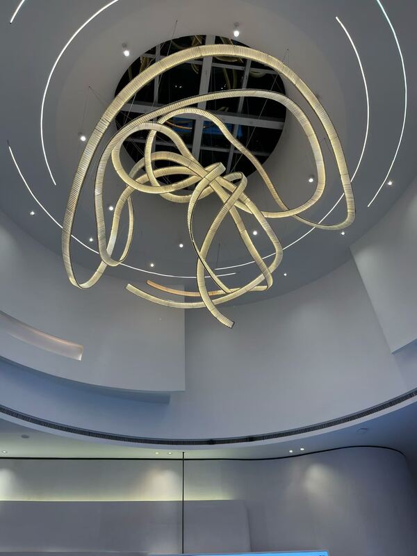 Ten elegancki żyrandol charakteryzuje się unikalnym wzorem inspirowanym wstążką w połączeniu z wysokiej jakości kryształowymi elementami, tworząc idealne połączenie artyzmu i wyrafinowania. W pełni konfigurowalny do niestandardowych projektów, jest idealny do sal bankietowych, klubów, holi hotelowych i działów sprzedaży. Kryształowe komponenty zapewniają genialne załamanie światła, tworząc luksusową i zapraszającą atmosferę.